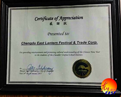 自貢燈貿集團股份有限公司、四川藝思特彩燈文化傳播有限公司主辦的“2016世界之光——彩燈嘉年華”跨年燈展,于當?shù)貢r間2017年1月29日在美國亞利桑那州首府菲尼克斯(鳳凰城)順利落下帷幕。成都市委副秘書長、印第安納州州長 Burns Mike及當?shù)卣獑T出席閉幕式并代表州政府對本次燈展頒發(fā)特令嘉獎。
