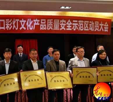 熬必強、陳張銘在會上做了重要講話。會上自貢燈貿(mào)集團股份有限公司等8家彩燈企業(yè)被示范區(qū)領(lǐng)導(dǎo)小組授予“自貢省級出口彩燈文化產(chǎn)品質(zhì)量安全示范區(qū)龍頭企業(yè) ”。